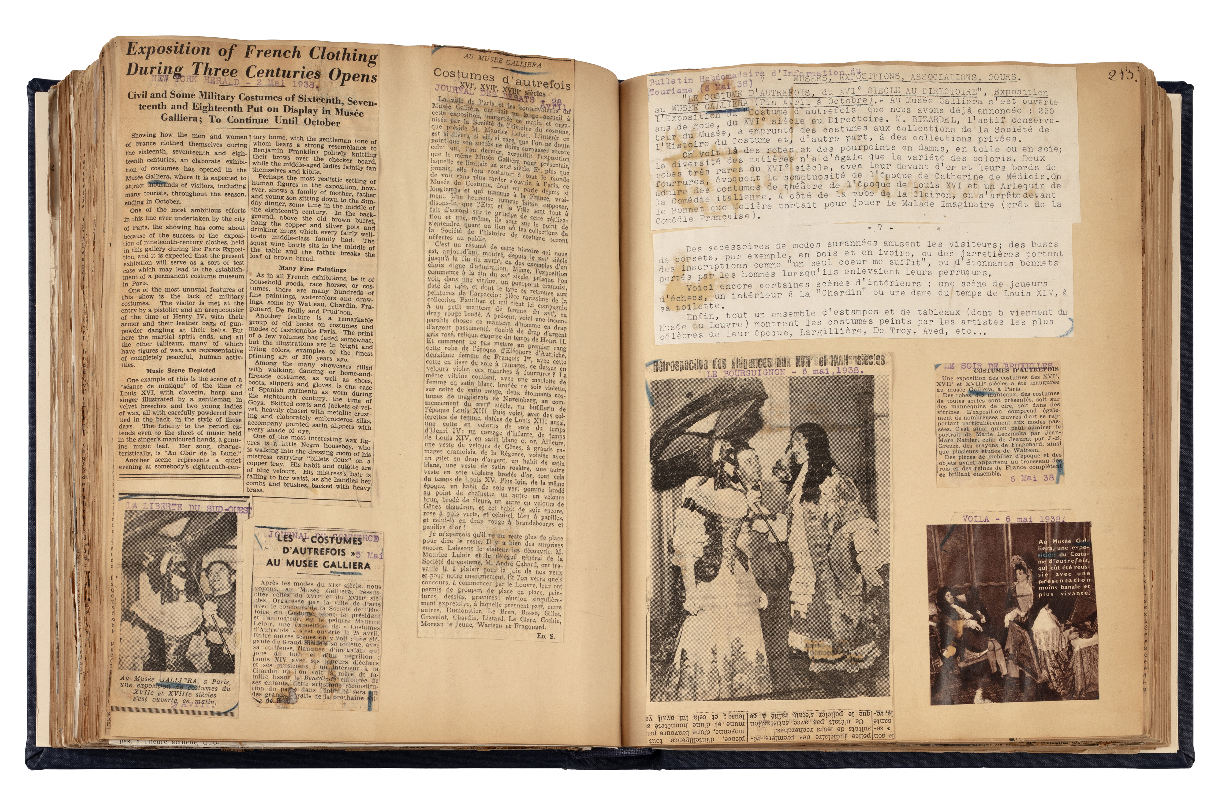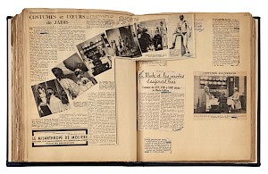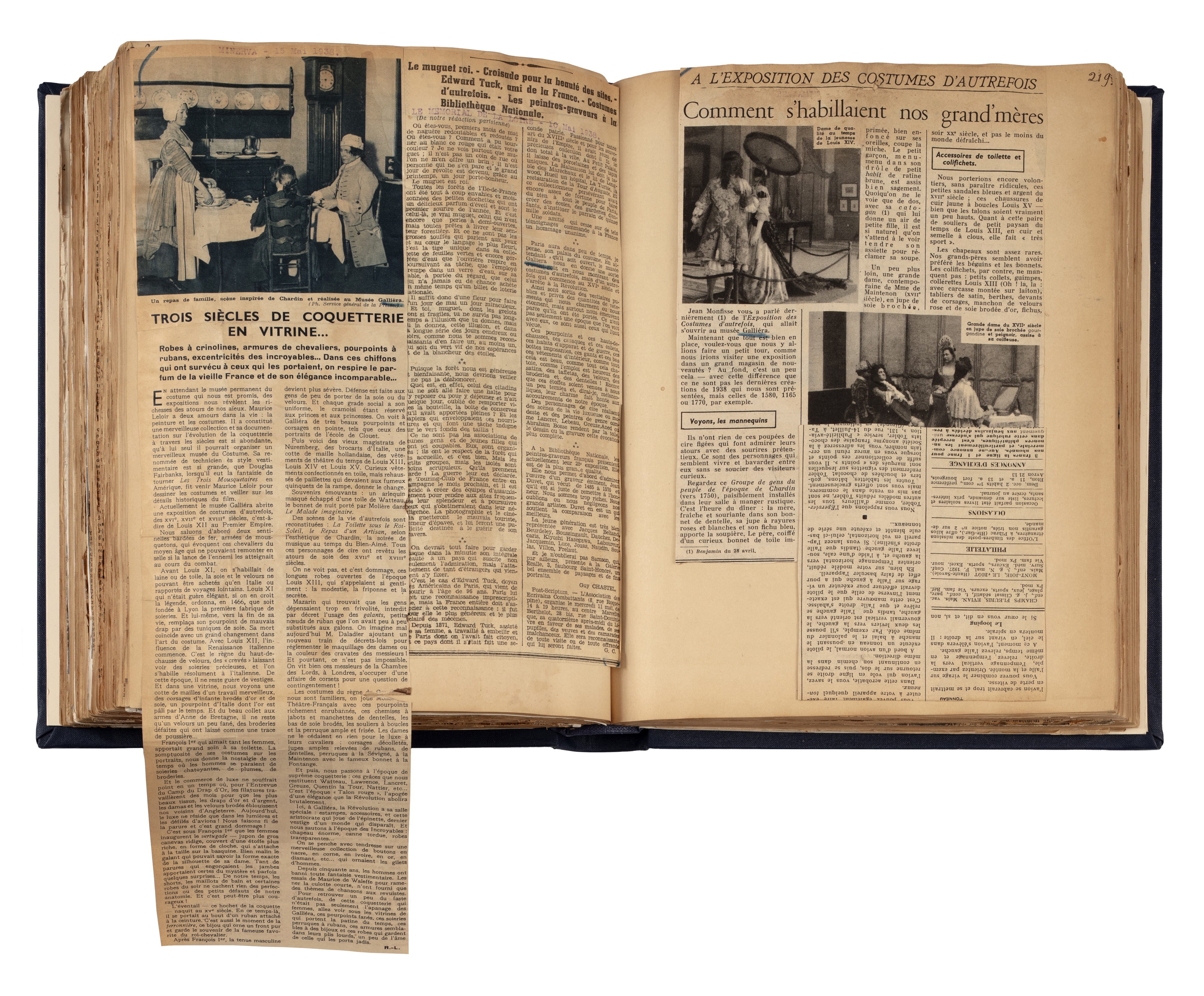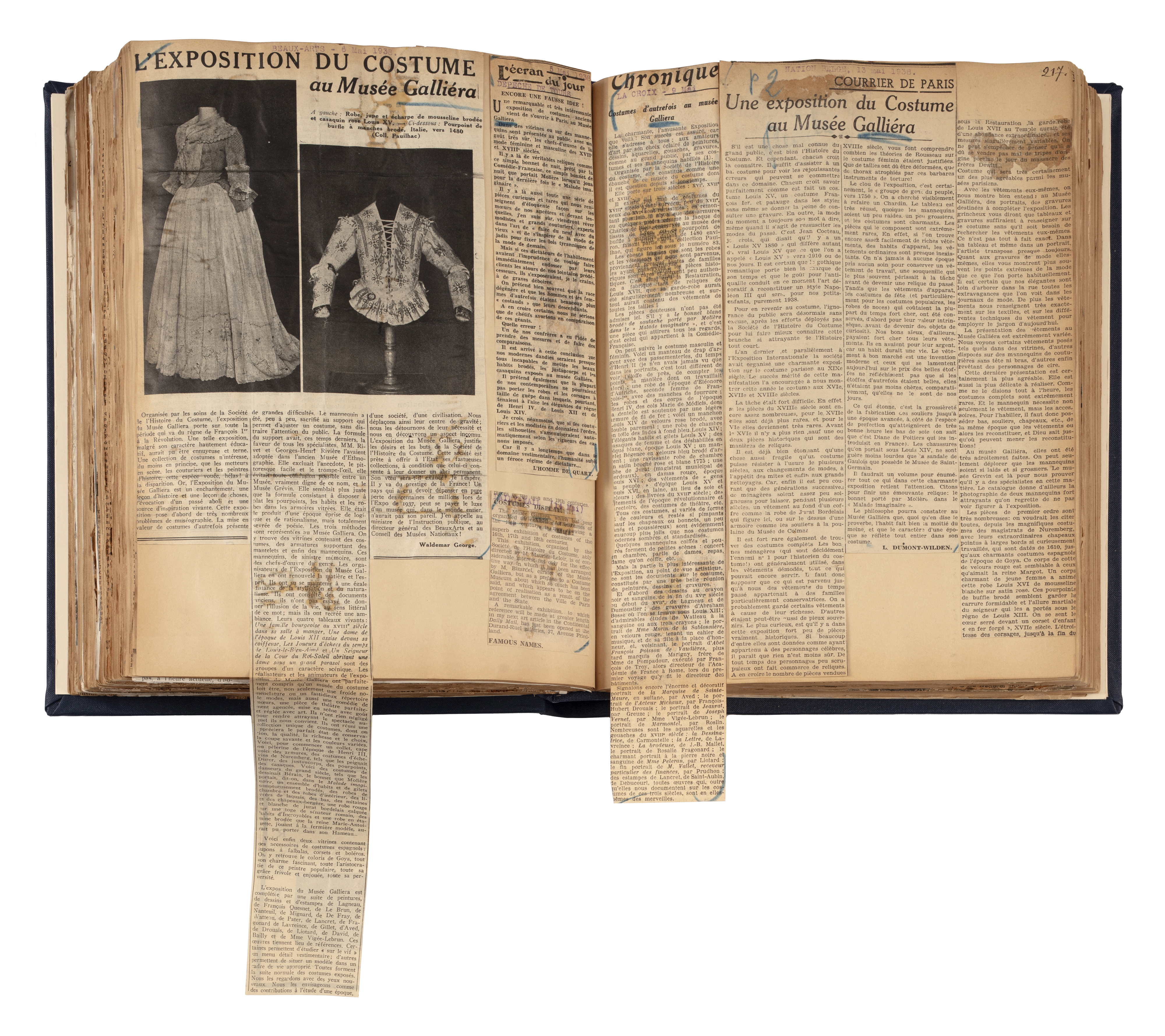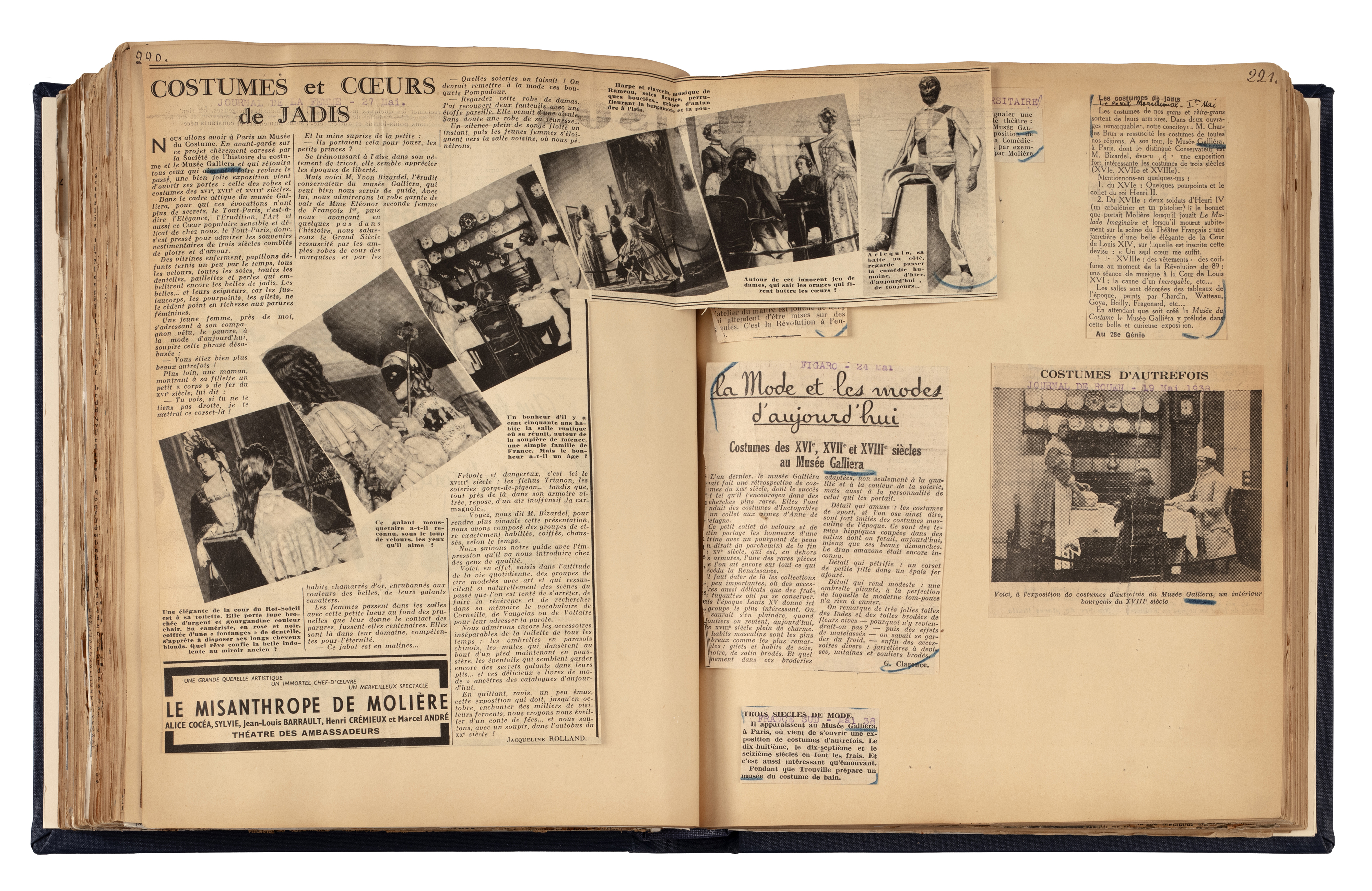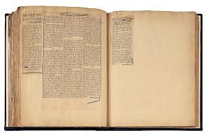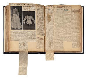 Livre de recueil des articles de presse pour l'exposition Costumes d'autrefois. XVIe, XVIIe, XVIIIe siècles