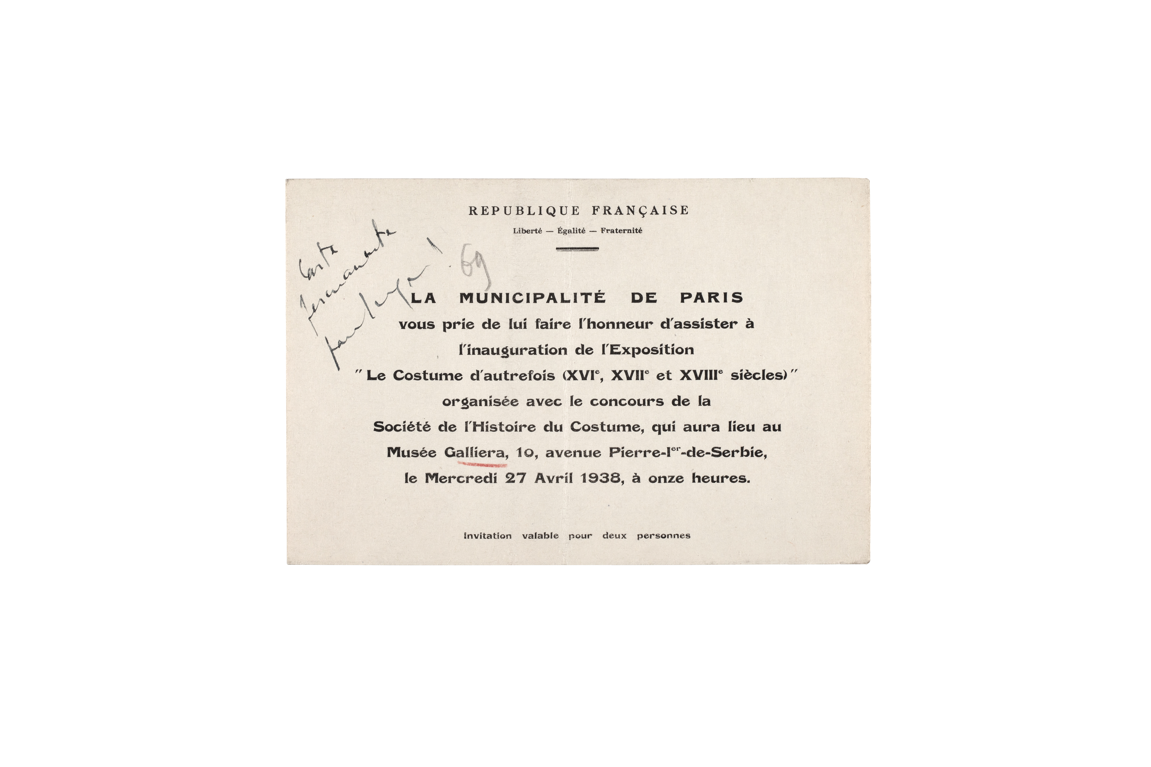 Carton d'invitation pour l'inauguration de l'exposition Costumes d'autrefois. XVIe, XVIIe, XVIIIe siècles, Musée Galliera, Paris
